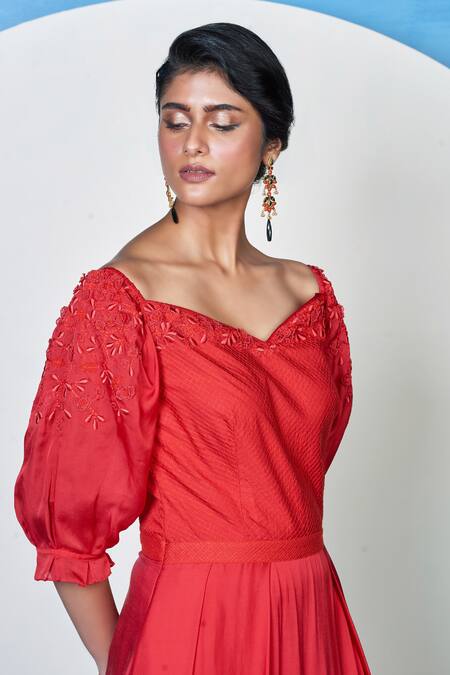Red organza gown featuring a sweetheart neckline and puff sleeves