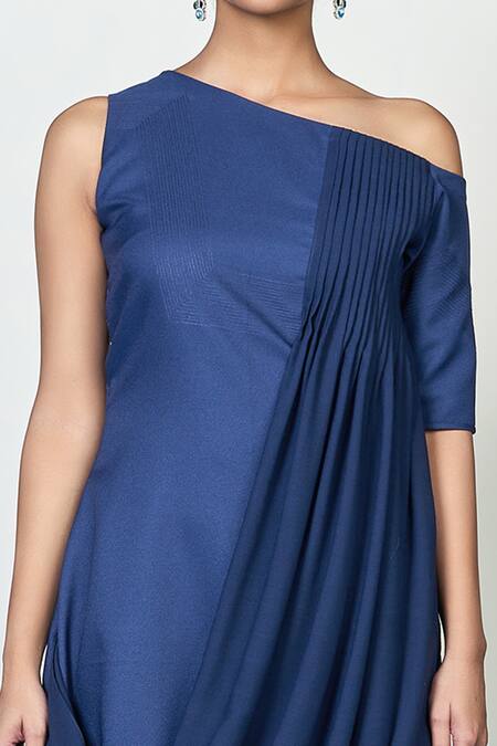 Blue off shoulder draped dress featuring pleated detailing and embroidery on the bodice
