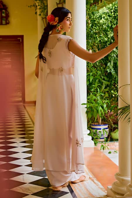 Beige Georgette Sequins, Zari, Embroidery Round , Open Jacket Skirt Set