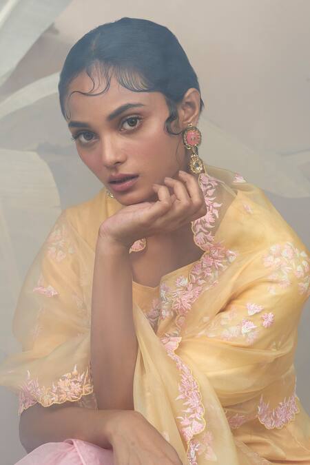 Yellow chanderi kurta featuring placement flower embroidery and notched round neck. Paired with a ruffle sharara and a sheer embroidered dupatta with scallop trim.