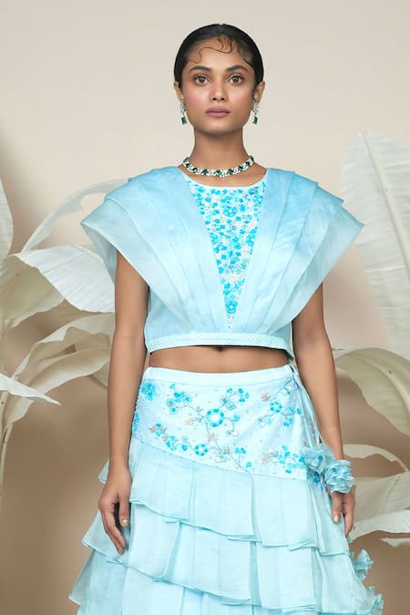 Blue organza ruffle lehenga featuring placement flower embroidery. Paired with a structured blouse showcasing flower embroidered yoke and short sleeves.