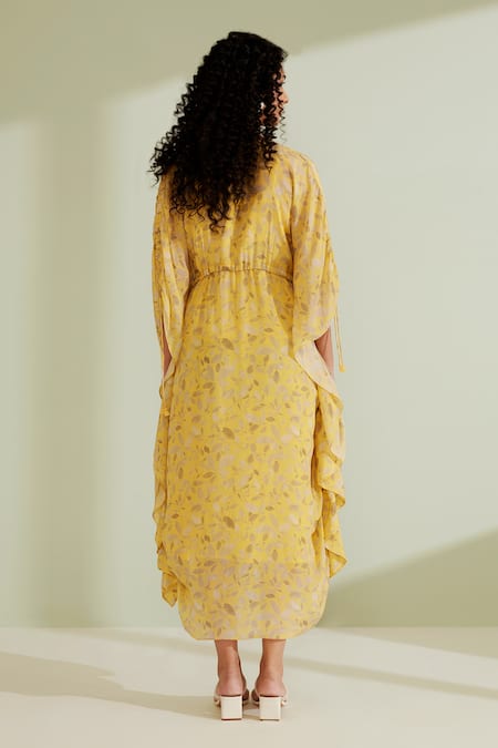 Yellow floral print kaftan featuring a V neckline and asymmetric sleeves
