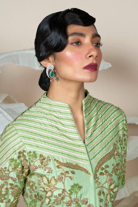 Green gown featuring floral embroidery with a notched neckline and half sleeves. Paired with a matching jacket adorned with zardozi and zari embroidery, complete with slit detailing and scallop edges.