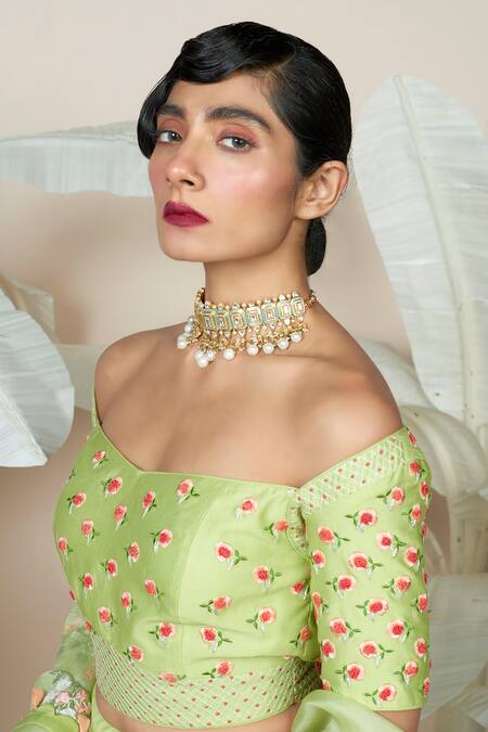 Green chanderi kalidar lehenga featuring intricate flower embroidery. Paired with an off shoulder blouse adorned with flower buttis and a flower embroidered dupatta.