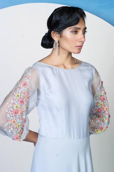 Grey satin gown featuring flower embroidered three quarter sleeves