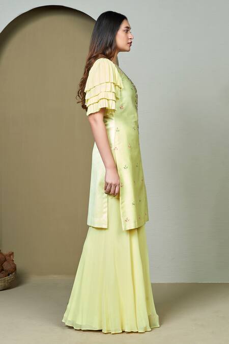Yellow chanderi kurta featuring flutter sleeves and flower butti embroidery. Paired with a matching sharara for a coordinated look.