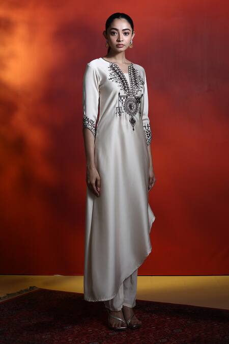 Buy_28 Threads_Cream Satin Embroidered Mirror Notched Asymmetric Kurta_Online_at_Aza_Fashions