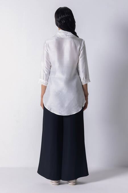 White Silk Cut Work Shawl Neck Scarf Attached Shirt