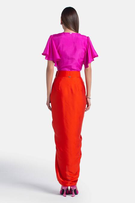Fuchsia silk crop top featuring a V neck and flared sleeves