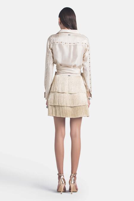 Beige Silk Crystals Collared Jim Draped Tie-up Shirt