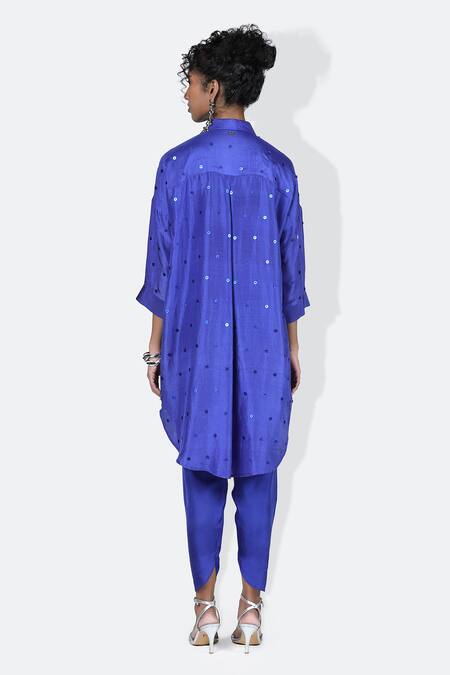 Electric blue longline high low shirt featuring three fourth sleeves and tonal sequins embroidery detailing