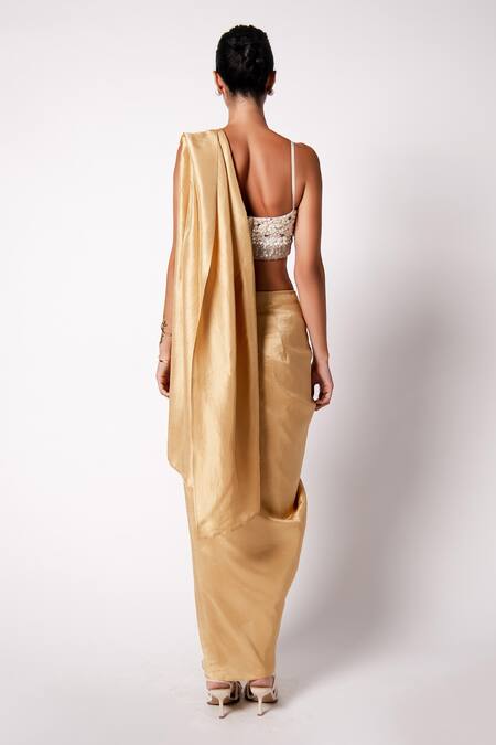 Gold silk pre-draped saree featuring godet detailing and waist attached pallu. Paired with an embroidered bustier showcasing sequins and shells work.