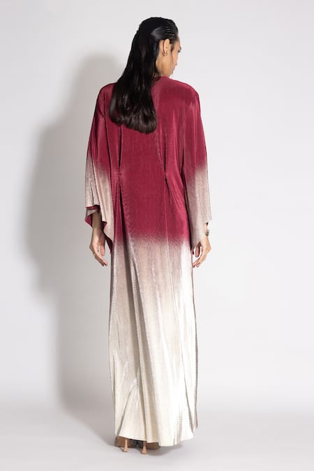 Maroon and gold ombre effect maxi gown featuring pleat detailing and a cinched narrow waistline