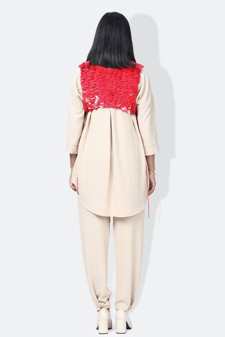 Beige high low solid shirt featuring three fourth sleeves and concealed front buttons placket. Paired with matching draped pant and red sequins encrusted overlay.