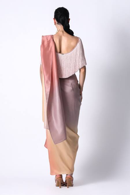 Peach and pink pre draped saree featuring an ombre pattern with embellished sequin work. Paired with a sleeveless fringe top and built-in petticoat.
