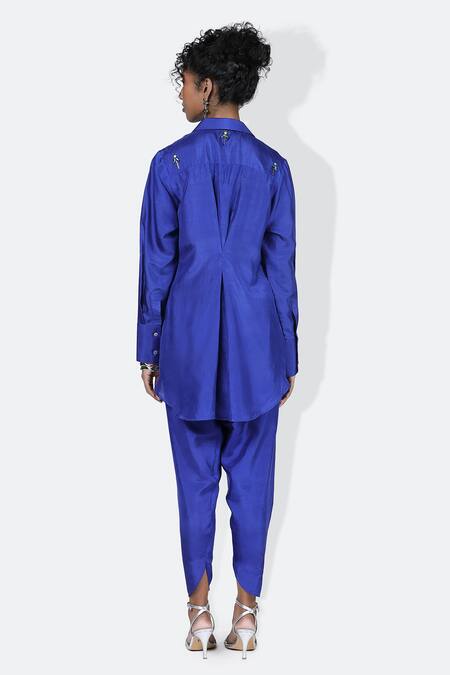 Electric blue longline shirt featuring full cuff sleeves and rhinestone fleur embroidery detailing