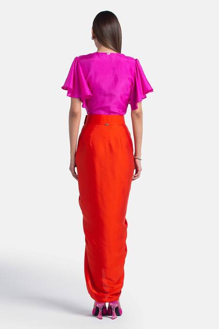 Orange skirt in a satin fabric featuring draping and a ruched front