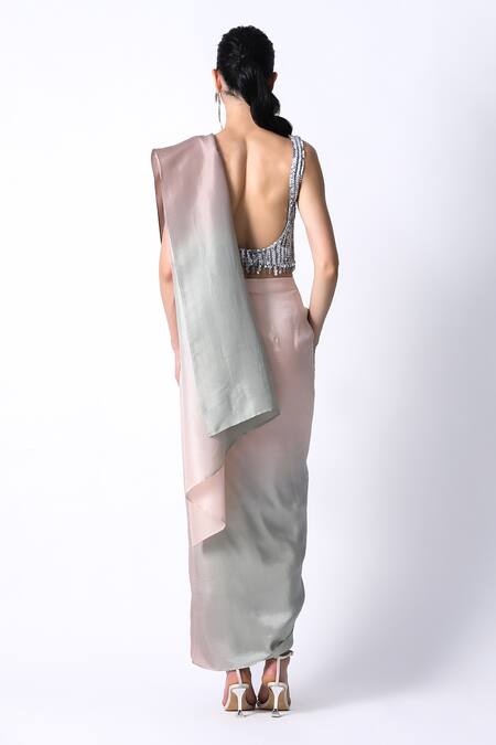 Salmon pink and silver silk pre draped saree featuring an ombre pattern. Paired with a sequin embellished sleeveless blouse with a round neckline.