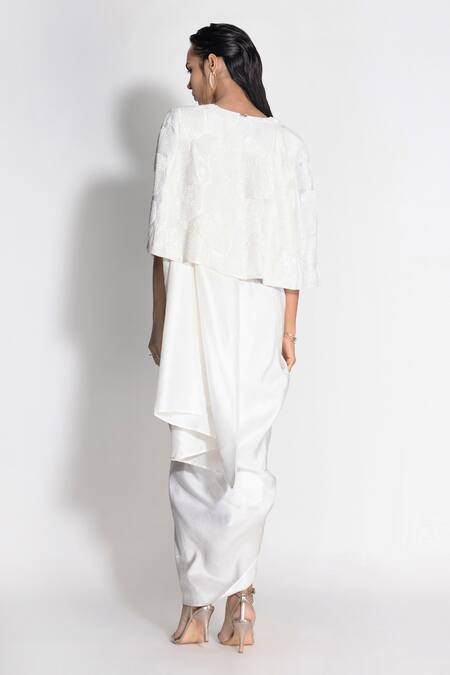 White silk pre-draped saree featuring an attached petticoat lining. Accompanied by a cutdana embellished blouse and short cape with split sleeves.