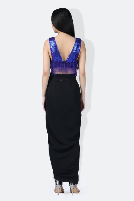 Black lungi draped skirt featuring a solid base and front button closure