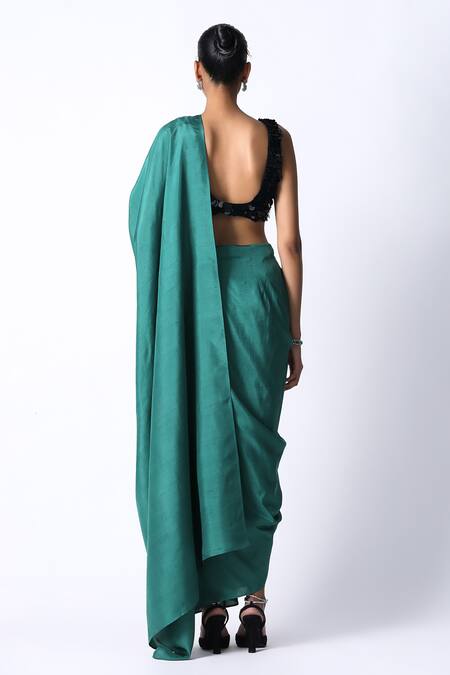 Forest green pre draped saree featuring a solid base and a front button closure. Accompanied by a sequin embellished sleeveless blouse with a V-neckline.