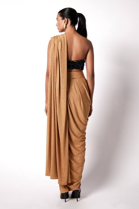 Gold pre-draped saree featuring sequins embroidery and a sweetheart neckline. Paired with a corset style bustier adorned with gold and black sequins.