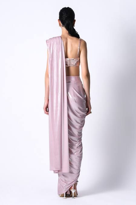 Pink pre draped saree featuring a metallic shimmer base and a sequin embellished blouse. Includes a built-in petticoat with a back closure on the blouse.