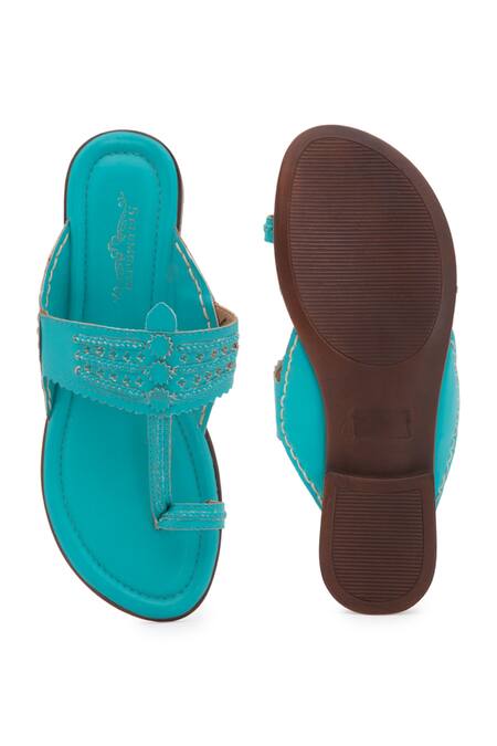 Turquoise Kolhapuris featuring braided strap, toe-ring, and floral motifs
