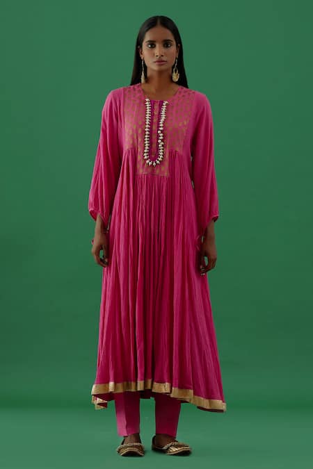 Pink cotton hand stitched anarkali featuring a ghungroo embellished silk brocade yoke. Paired with matching pant for a complete look.