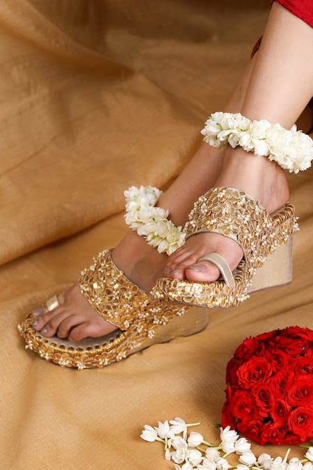 Gold wedges featuring gota and pearl embellishments with split toe detailing