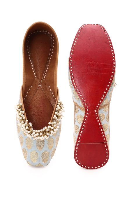 Light blue brocade juttis featuring floral zari bootis and embellished with front pearl work