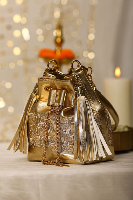 Gold potli bag featuring intricate floral embroidery and gota work. Comes with a detachable handle and tassels for added flair.