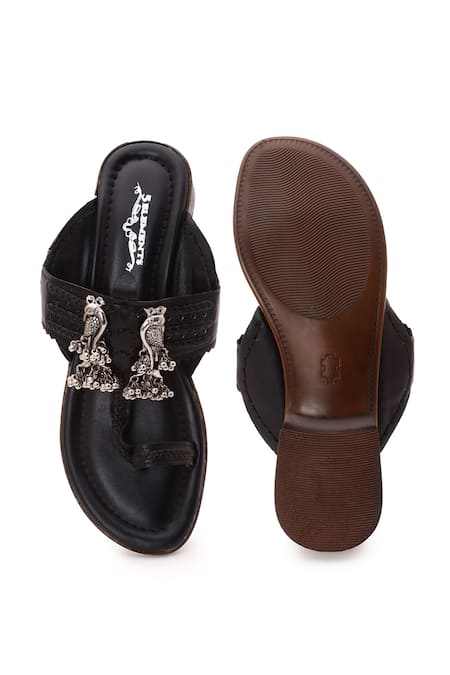 Black leatherette Kolhapuris featuring handcrafted metallic peacock motifs and ghungroo embellishments
