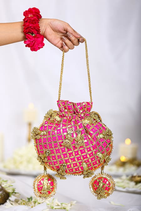 Pink potli bag featuring a parrot motif and ghungroo cluster embroidery