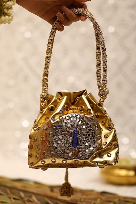 Gold potli featuring peacock embroidered patterns with mirrorwork, beads, and sequins. Comes with an attached beaded handle and drawstring closure.