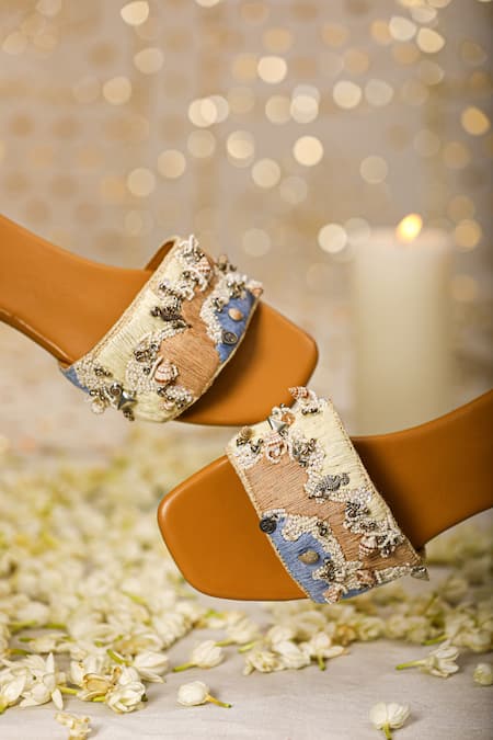 Beige sliders featuring pearl, shell, and metal brooch embellishments on the strap with square toe detailing. Crafted from leatherette for a stylish look.