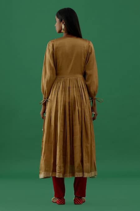 Gold Anarkali featuring bead embroidery, keyhole neckline, and tie-up sleeves. Paired with contrast pant and embroidered dupatta.