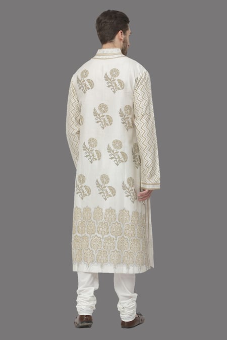 Ivory chanderi kurta featuring floral and chevron print with a mandarin collar. Paired with a matching churidar for a complete look.