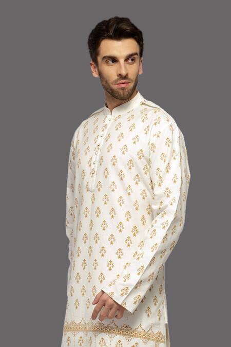 Ivory straight kurta featuring a floral print and a band collar. Paired with a matching salwar for a complete look.