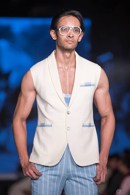 Ivory Handloom Cotton Solid Placed Checkered Pocket Waistcoat