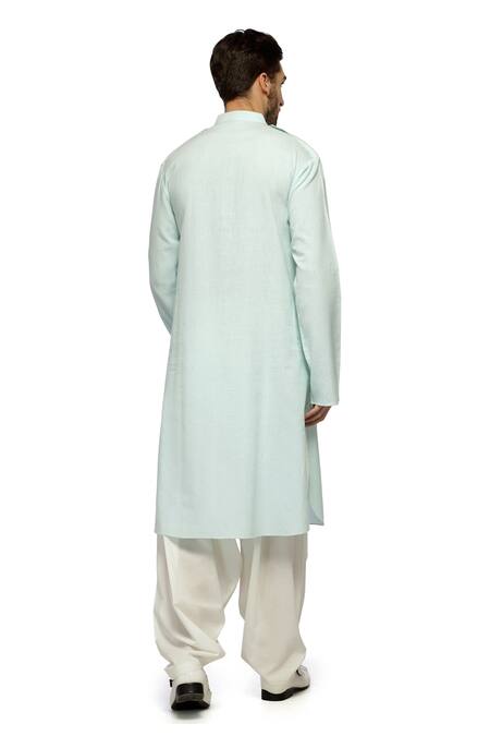 Powder blue straight kurta featuring a band collar, long sleeves, and two flap pockets. Paired with a matching salwar for a complete look.