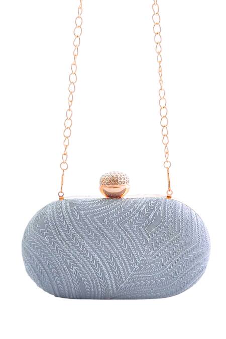 Grey silk clutch featuring a textured herringbone pattern. Includes a detachable sling chain for versatility.