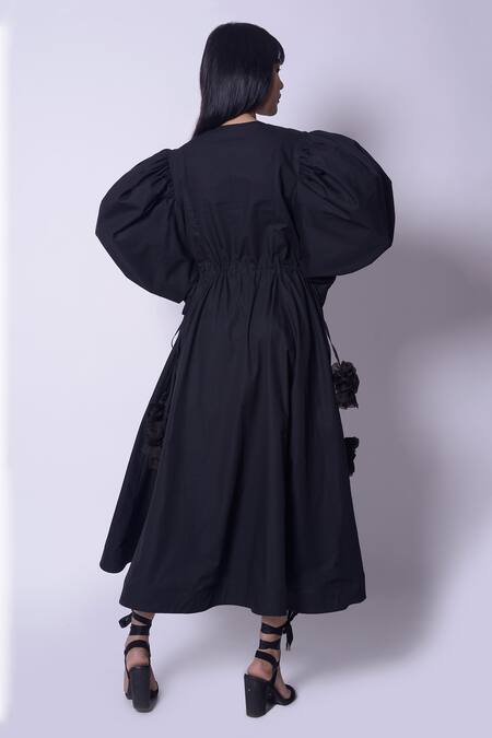 Black midi dress with exaggerated balloon sleeves.