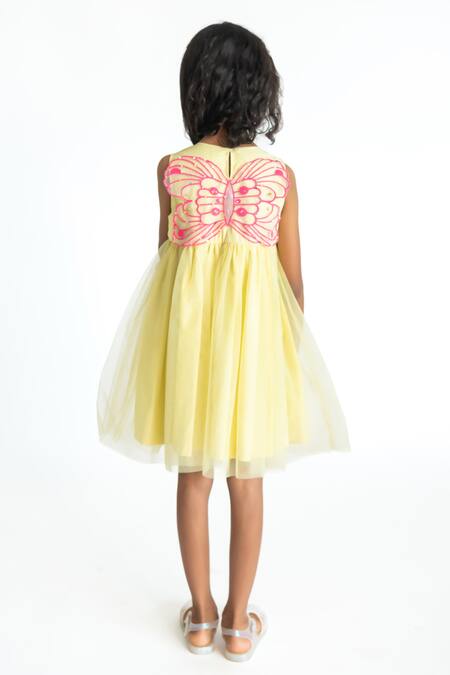 Yellow dress featuring a pleated yoke and back placement 3D butterfly applique