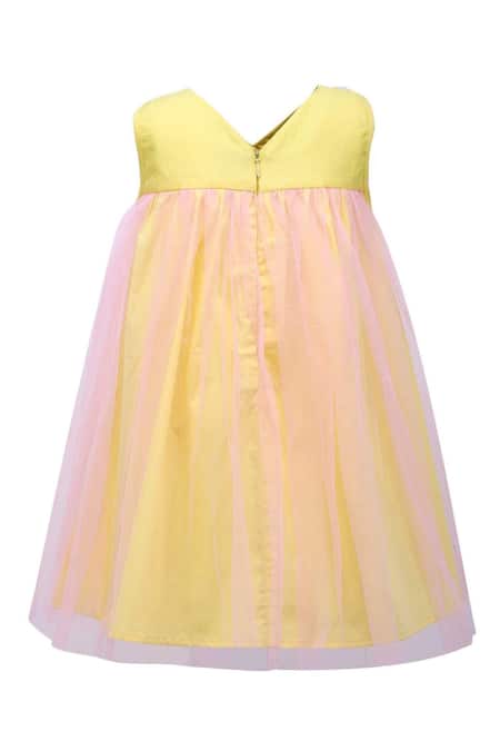 Yellow Cotton, Tulle Fabric Flowers Floral Embroidered Dress