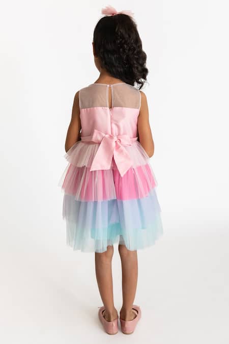 Multi color layered tulle dress featuring unicorn embroidery and 3D effect ears