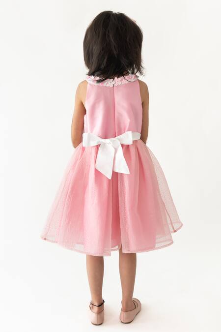 Pink layered dress featuring floral applique, sequin embellishments, and an attached back belt