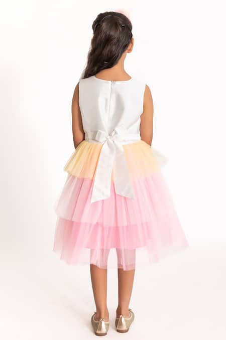 Placement unicorn print on the bodice, Floral sequin and stone embellishments on yoke, Multi-color layered ruffle panels