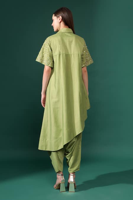 Buy_Aakaar_Green Cotton, Silk Sequins, Beads Asymmetric Panel Kurta With Salwar Pant _at_Aza_Fashions