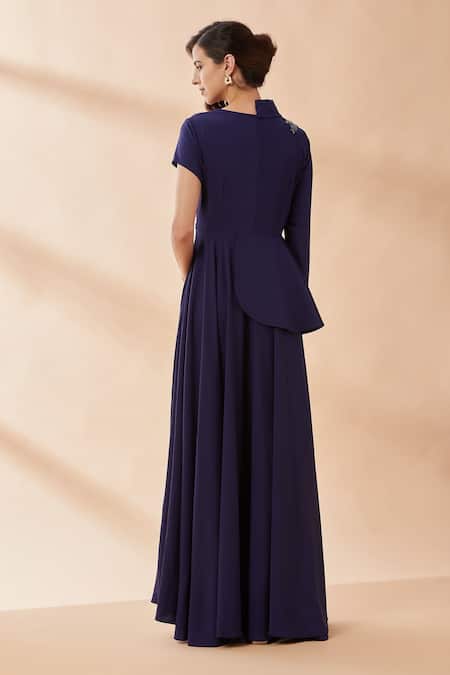 Navy blue blazer style gown with cutdana embroidered motifs and one side lapel collar.